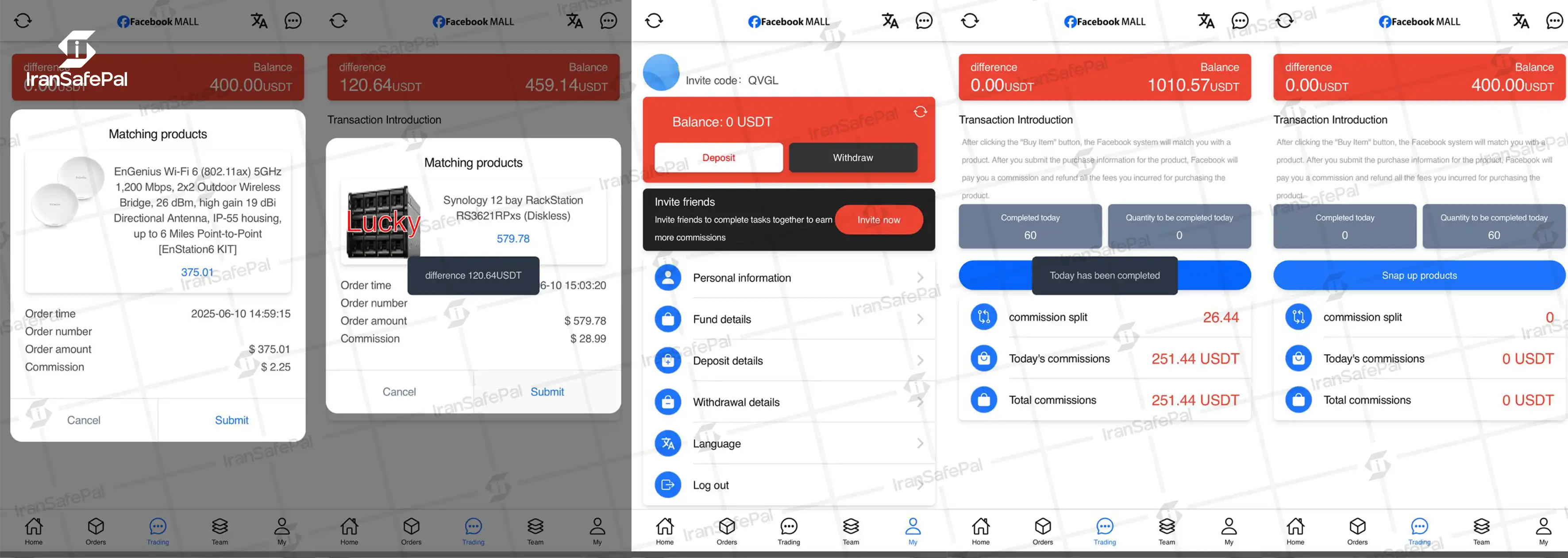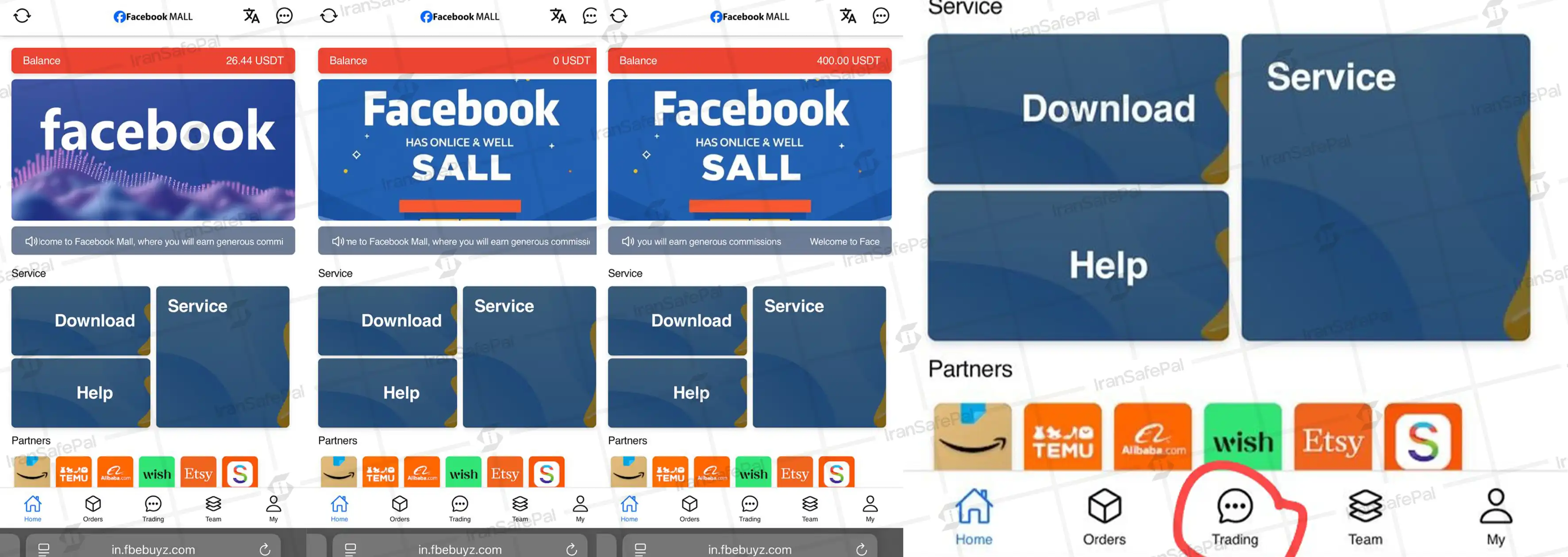 در این مرحله، پلتفرم جعلی فیسبوک مال معرفی میشود:من از طریق سایت فیسبوک مال کار میکنم. این پلتفرم بهت پول میده برای تأیید سفارشها یا خرید و فروش آزمایشی. خیلی سادهست. اگر بخوای، لینکش رو برات میفرستم. قربانی وارد سایتی میشود که طراحی آن با رنگبندی آبی و سفید، لوگوهای تقلبی و فرمهای ابتدایی سعی دارد شباهت گرافیکی به پلتفرمهای اصلی متا یا فیسبوک داشته باشد. اما در واقع هیچ ارتباط واقعیای با آنها ندارد.