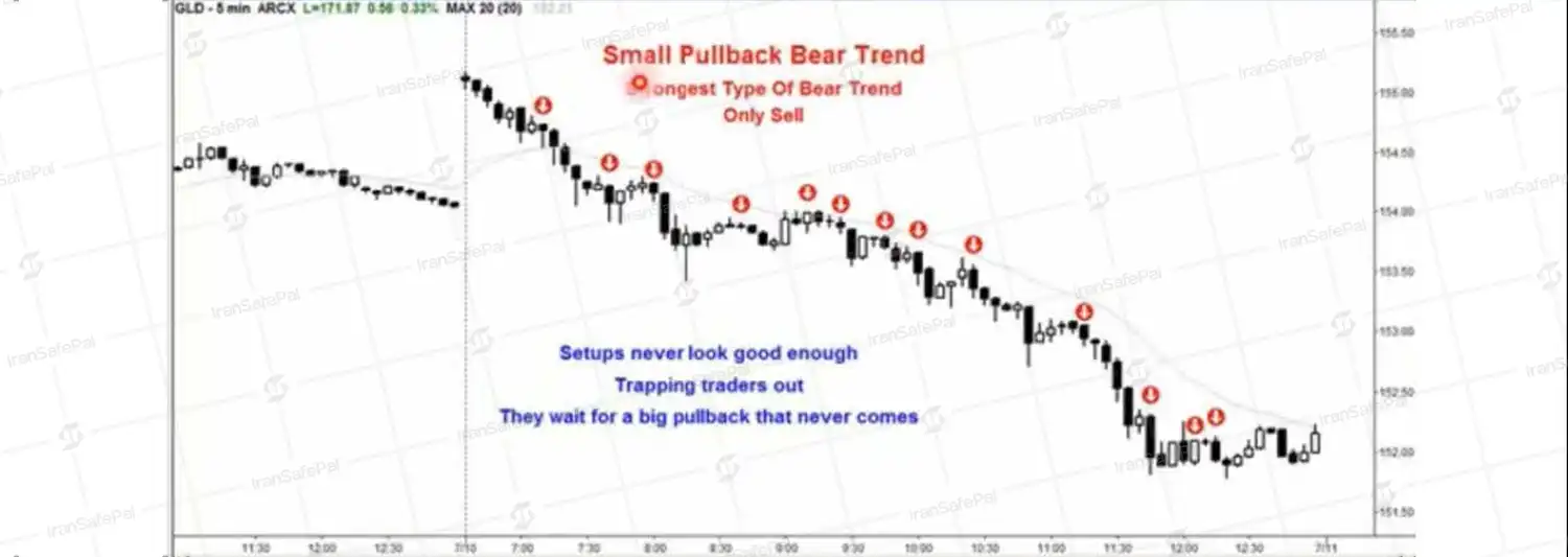 در اینجا یک روند نزولی با پولبک های کوچک داریم که قویترین نوع روند است. ببینید پولبک ها چقدر کوچک هستند. کف جدیدی شکل گرفته، اما حرکت صعودی بازار خیلی کوچک است. ستاپ های فروش را ببینید. در اینجا و اینجا شمع صعودی داریم. در اینجا هم شمع صعودی داریم. این شمع های سیگنال، قوی نیستند. در اینجا دوجی داریم. در اینجا هم شمع سیگنال دوجی داریم. در این جا شمع صعودی داریم. ستاپ ها هیچ وقت به اندازه کافی خوب به نظر نمی آید. و این باعث می شود که اکثر معاملهگران نفروشند. پس آنها در دام میافتند و یک روند نزولی قوی را از دست می دهند. چون آنها در انتظار پولبک عمیق تر هستند که امنتر باشد. همچنین منتظر میمانند تا شمع خوبی برای برگشت نزولی شکل بگیرد. اما این شمعها را نمیتوانید پیدا کنید. چون روند با پولبک های کوچک، معمولا به این شکل است. یعنی پولبک ها هیچ وقت به اندازه کافی بزرگ نیستند که بخواهیم بفروشیم. و شمع سیگنال هم هیچ وقت به اندازه کافی خوب به نظر نمیاد که بخواهیم بفروشیم. اما حتماً باید معامله کنید.