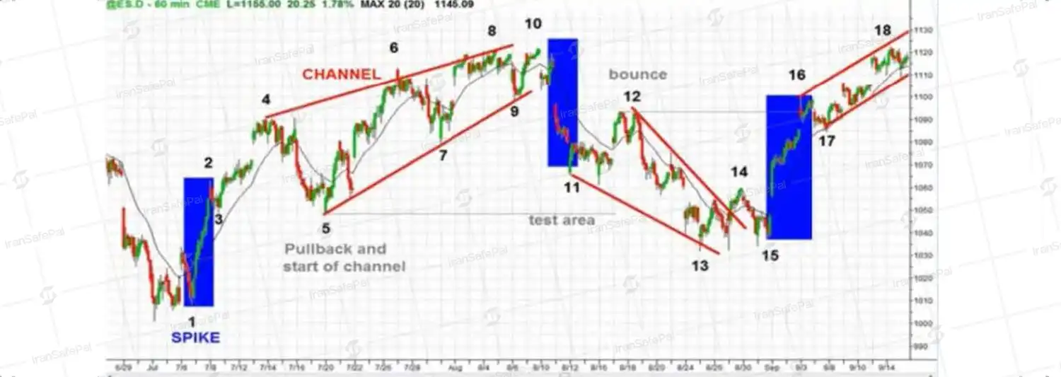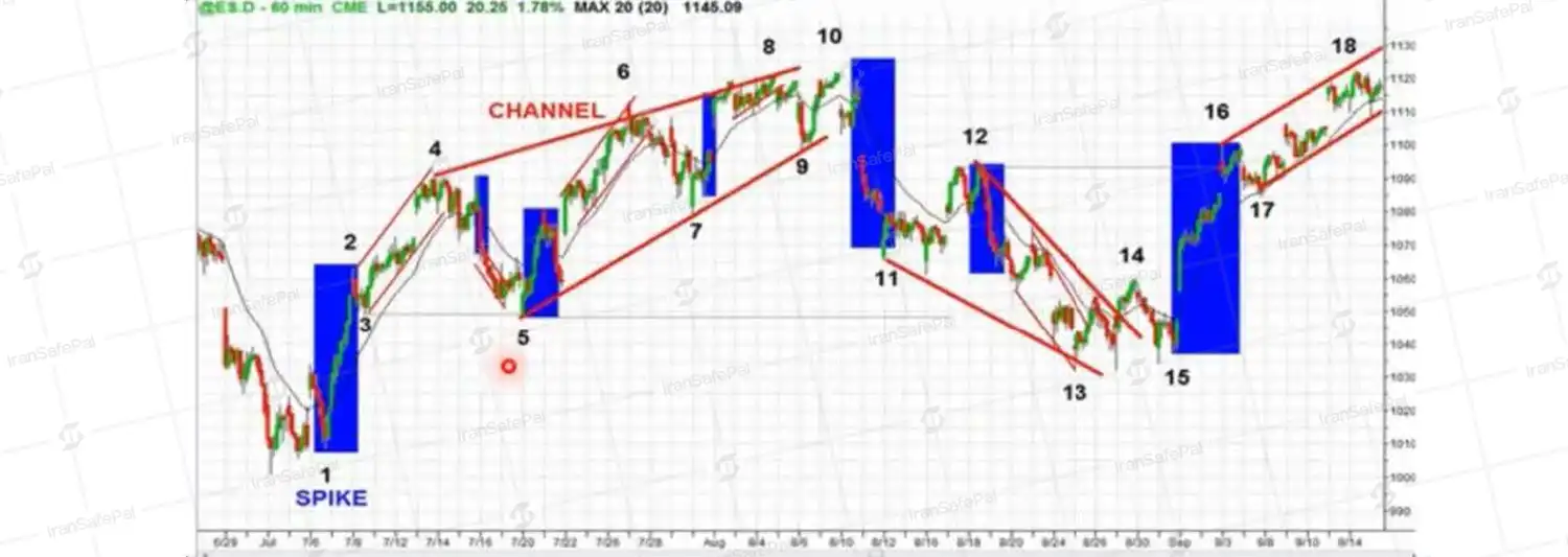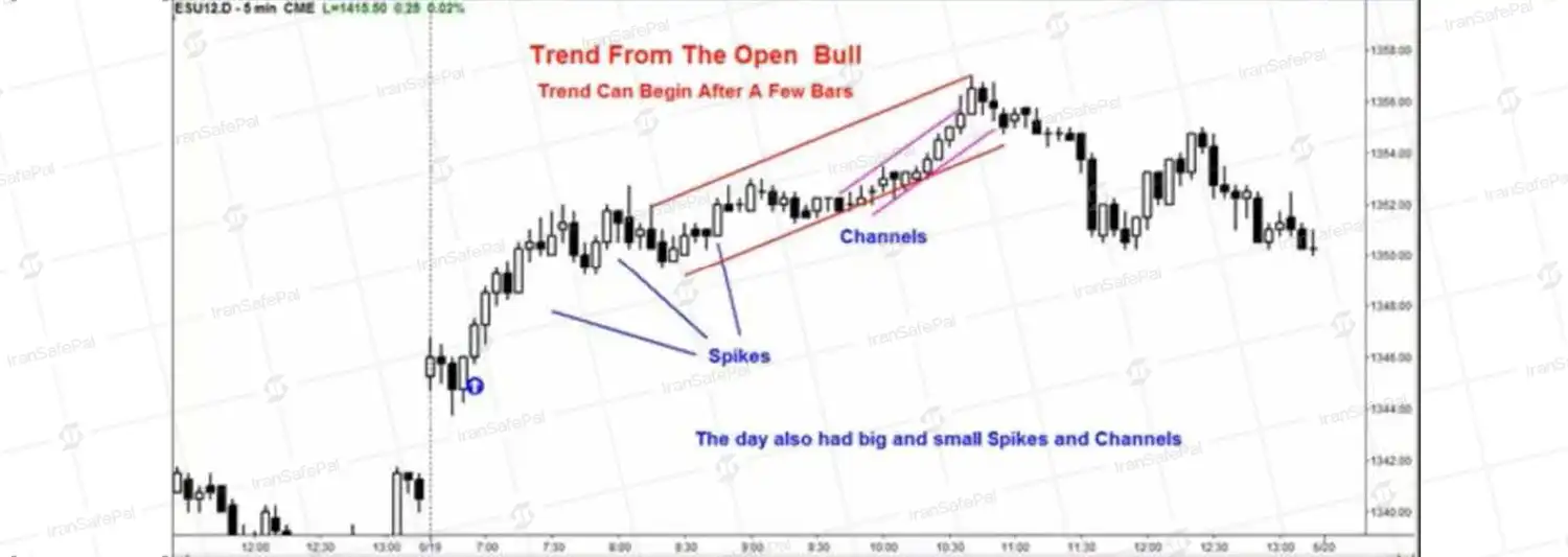 در این مثال در شروع روز یک روند صعودی داریم. روند سمع سوم شروع شده. سومین شمع همان کف روز میباشد که بعد از آن، روند صعودی آغاز شده است. تا اینجا یک اسپایک صعودی داریم. در اینجا هم یک اسپایک دیگر داریم و بعد یک کانال داریم. چند تا اسپایک داریم که به کانال های متفاوتی ختم شده اند.