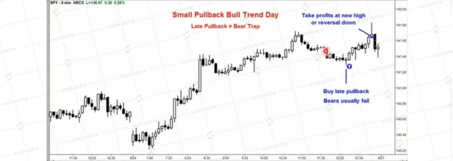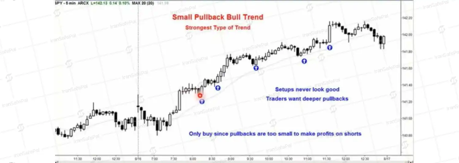 قویترین نوع روند، روندی است که پولبک های کوچکی دارد. به اندازه پولبک ها دقت کنید. خیلی خیلی کوچک هستند. در کل روز، پولبک های خیلی کوچکی داشتیم. معمولاً پولبکی که در انتهای روز شکل میگیرد، ۵۰ درصد و یا ۱۰۰ درصد بزرگتر از پولبک های قبلی است. در اینجا پولبک در ابتدای روز شکل گرفته، پس وقت کافی برای خرید آن نداشتیم. ستاپ ها هیچ وقت آنقدر خوب به نظر نمیان. در اینجا شمعهای سیگنال را ببینید که خیلی خوب به نظر نمی آیند. پولبک ها خیلی کوچک هستند و نمی توانیم از طریق فروش، سودی کسب کنیم. پس فقط باید بخرید. و در کل روز باید بخرید.