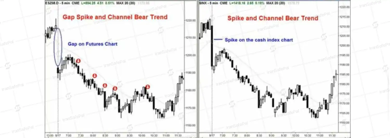 در این چارت نوع خاصی از اسپایک و کانال را داریم. در شاخص کش، اسپایک نزولی و کانال داریم. در چارت آتی S&P، به جای شمع روندی، شکاف داریم. به خاطر داشته باشید که هر شمع روندی، همان شکاف است و هر شکاف هم، همان شمع روندی است. پس این شکاف، یک شمع روندی و اسپایک است. پس در این نوع روند، کانال داریم و اسپایک هم در قالب شکاف می باشد. که یک حالت دیگر از روندی است که در آن کانال و داریم داریم.