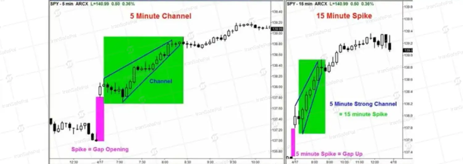 در اینجا یک مثال داریم .یک شکاف و اسپایک داریم. در اینجا اسپایک شامل این شکاف و شمع صعودی بعد از آن است. سپس یک کانال داریم، اما در کانال پولبک های خیلی کمی داریم و کانال خیلی باریک است. این نوع کانال معمولاً در تایم فریم بالاتر، یک اسپایک است در سمت راست همین چارت را در تایم فریم ۱۵ دقیقه ای داریم. این مستطیل صورتی نشان دهنده شکاف است. و این هم همان کانال پنج دقیقهای است. کانال پنج دقیقهای در سمت چپ به این صورت است و در چارت ۱۵ دقیقه ای به این صورت است. که یک اسپایک صعودی خیلی قوی داریم. پس وقتی یک کانال پنج دقیقه ای می بینید که خیلی باریک است، آن را همانند اسپایک معامله کنید چون این کانال در تمرین بالاتر همان اسپایک است.