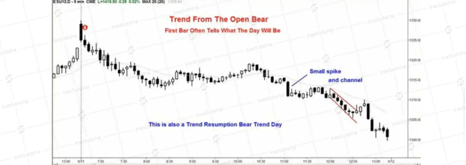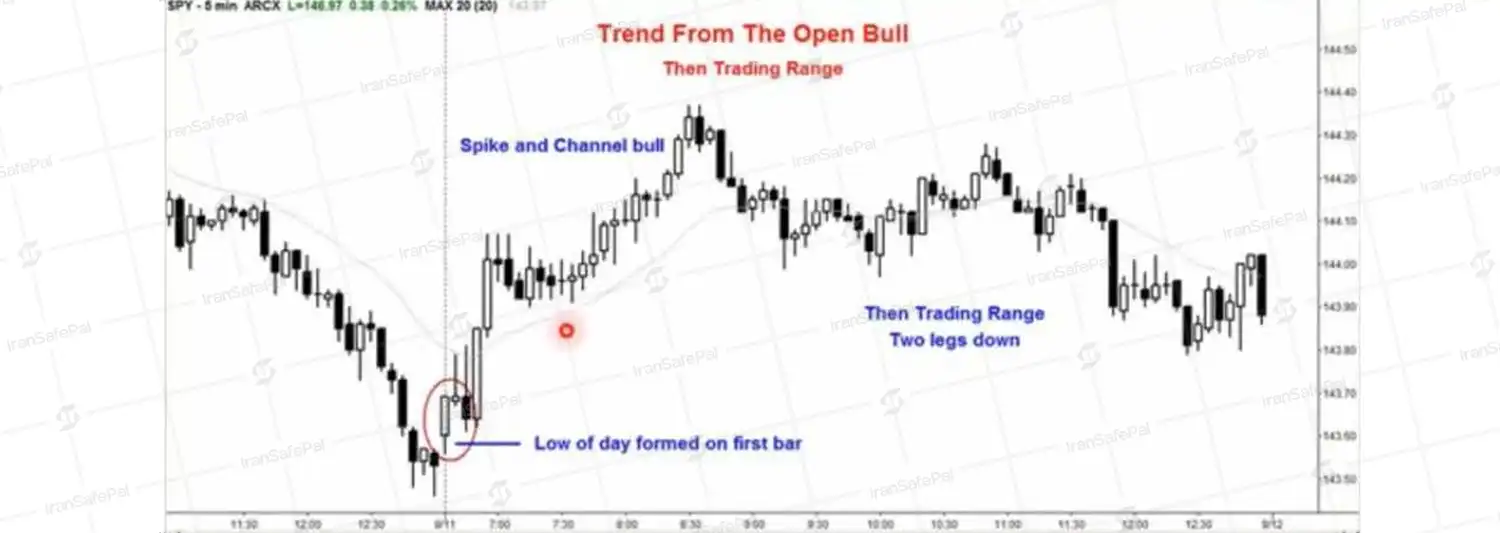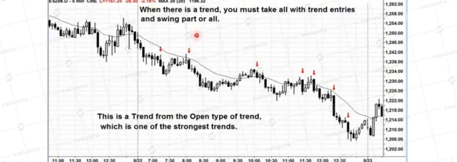 حال نوع دیگری از روند را بررسی می کنیم که از شروع روز، آغاز می شود. معمولا این روند، قوی است. در این حالت، در اولین یا چند شمع اول در ابتدای روز، بازار سقف یا کف روند را شکل می دهد. در این حالت بازار معمولاً در یک یا دو ساعت اول، به روند تشکیل می دهد. و معمولا سقف و کف روند می تواند با اولین شمع شروع شود. معمولا به عنوان اکستریم در کل روز باقی میماند، که نشان دهنده عجله و ضرورت بازار است. مثلاً اگر اولین شمع، یک شمع صعودی قوی باشد و در کل روز ،بازار در روند صعودی قرار گیرد، آنگاه این حالت نشان دهنده عجله بازار است و معمولاً نشان دهنده وجود یک روند صعودی قوی است. گاهی اوقات ممکنه به دامنه معاملاتی تبدیل شود. اما اکثر اوقات وقتی در ابتدای روز روند داریم، معمولا روند قوی می باشد.