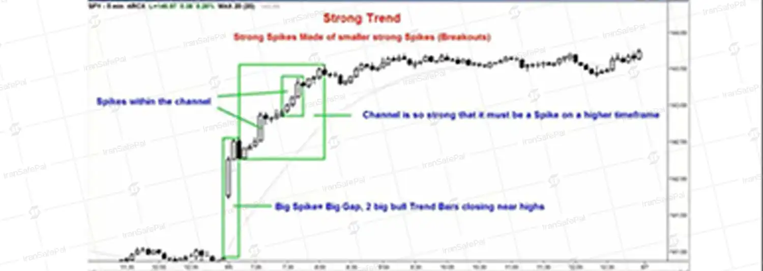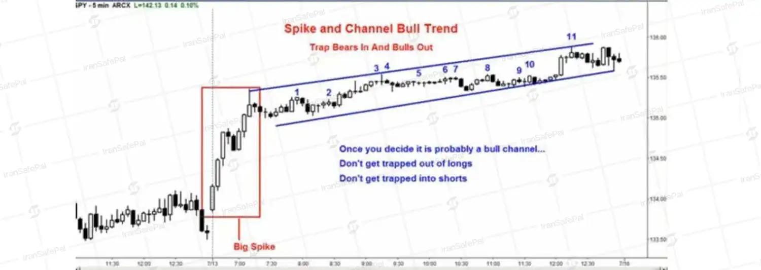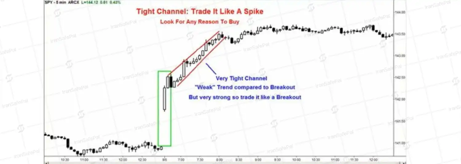 وقتی کانال خیلی باریک باشد، همچنان در مقایسه با شکست، یک روند ضعیف است. به خاطر داشته باشید که روند می تواند قوی یا ضعیف باشد. روند قوی همان شکسته است. و روند ضعیف هم به معنای کانال است. اما اگر گاهی اوقات کانال میتواند شیب زیادی داشته باشد و نسبتاً عمودی باشد؛ یعنی خیلی باریک باشد و پولبک های کوچکی داشته باشد که معمولا در تایم فریم بالاتر همان اسپایک است. وقتی یک کانال خیلی قوی دارید که قدرت شکست را دارد ،آنگاه آن را همانند شکست معامله کنید. یعنی فقط در جهت روند معامله کنید و به دنبال سوئینگ کردن باشید.