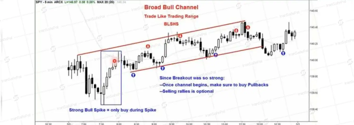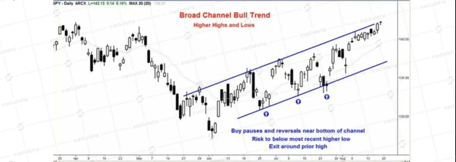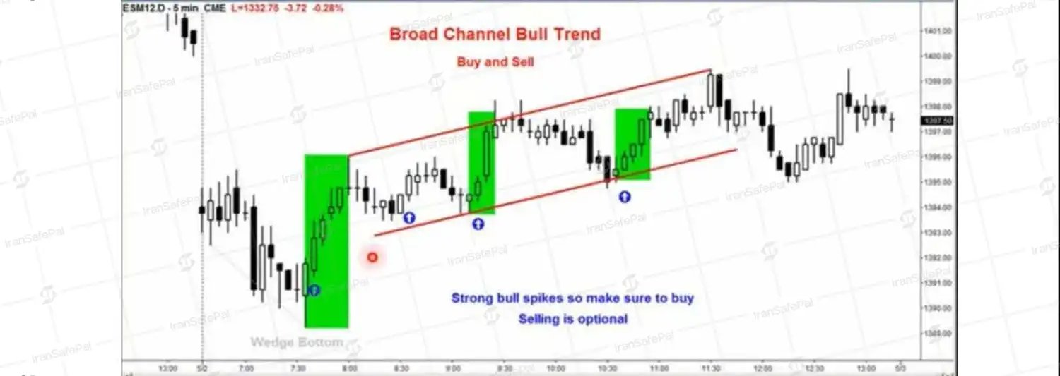 در اینجا مثالی از یک کانال عریض داریم. یک اسپایک صعودی داریم. و بعد سوئینگ های بزرگی داریم که بالا و پایین می شوند. مطمئناً در اینجا باید به دنبال خرید باشید چون یک روند صعودی داریم. کانال صعودی هم یک روند صعودی است. پس باید به دنبال خرید باشید. و اگر ستاپ قوی داشتیم، می توانید به فروش هم فکر کنید. در این حالت، فروش اختیاری است.