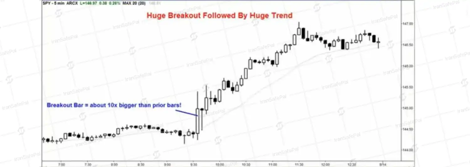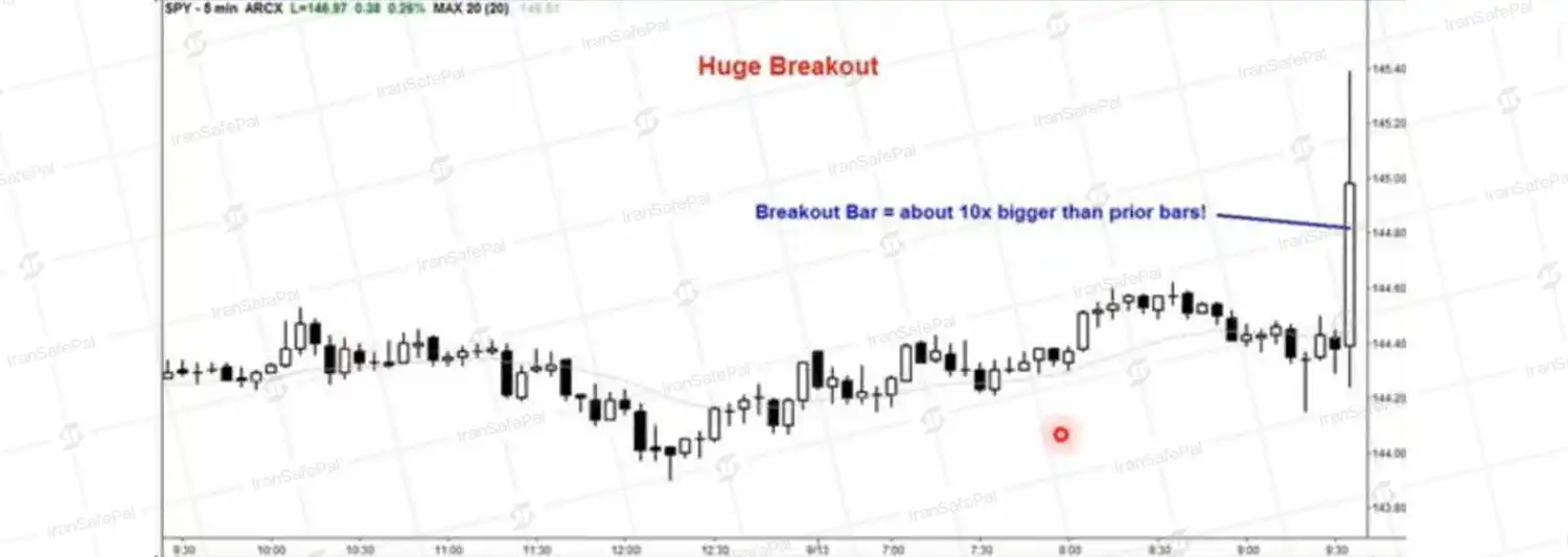 به این دامنه معاملاتی نگاه کنید، در کل روز یک دامنه معاملاتی آرام داشتیم. و بعد در ساعت ۹:۳۰ یک خبر توسط کمیته بازار آزاد فدرال منتشر شده و بعد این شمع را ببینید یک شمع خیلی بزرگ شکل گرفته و فقط در چند دقیقه حدوداً به اندازه یک درصد افزایش یافته و حدوداً ده برابر بزرگتر از شمع های قبلی است. این یک شمع صعودی خیلی بزرگ از نوع روندی است. حتی با وجود اینکه سایه بالایی بلندی دارد، اما بدنه بزرگی هم دارد. پس از این شکست صعودی بزرگی است.