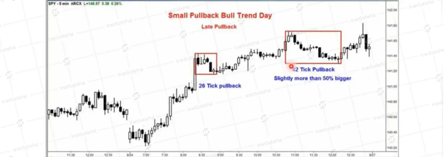 روندی که پولبک های کوچکی دارد، معمولا در یک یا دو ساعت اول شروع میشود و پولبکها خیلی کوچک هستند. مثلاً کوچکتر از دو برابر یک شمع متوسط هستند. و معمولاً بعد از ساعت ۱۱ یا ۱۱:۳۰، پولبکی شکل می گیرد که ۵۰ درصد یا ۱۰۰ درصد بزرگتر از پولبک قبلی است و بعد روند ادامه مییابد. مثلاً فرض کنیم یک روند نزولی داریم که از نوع پولبک کوچک میباشد. و بزرگترین پولبک، ۲ پوینت بوده است. در انتهای روز به دنبال پولبکی هستیم که ۵۰ درصد یا ۱۰۰ درصد بزرگتر باشد. یعنی به جای پولبک ۲ پوینتی، در انتهای روز منتظر پولبک ۳ یا ۴ پوینتی هستیم. یعنی به اندازه ۳ یا ۴ پوینت افزایش داشته باشیم. و به دنبال فروش هستیم چون انتظار داریم که روند ادامه یابد. یعنی روند نزولی ادامه یابد.