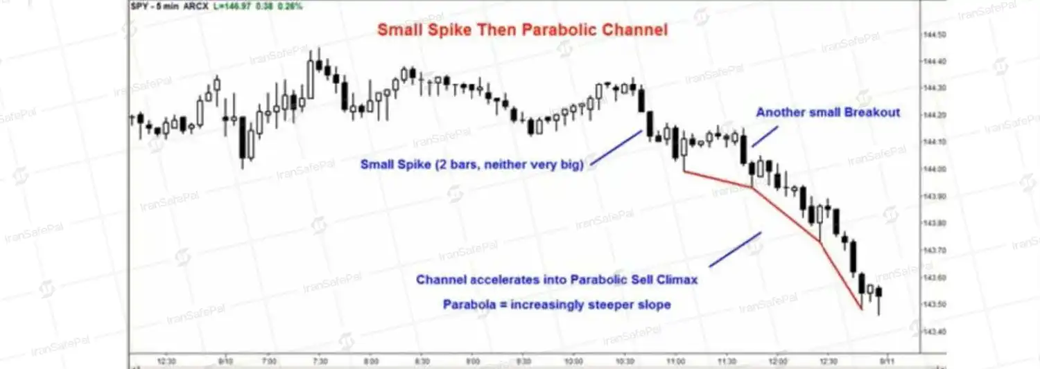 در اینجا یک مثال دیگر داریم. یک اسپایک داریم که دارای دو شمع است است که در دامنه معاملاتی شکل گرفته است. که میتونه وکیوم فروش باشد که کف دامنه را تست کرده است. که این حالت در اینجا و اینجا هم اتفاق افتاد. در اینجا هم همینطور. پس اینجا هم میتونه همینطور باشه. اما هر وقت که یک اسپایک نزولی میبینید باید به این فکر کنید که میتونه نقطه شروع روند نزولی باشه و ممکنه بعد از آن کانال داشته باشیم. که در اینجا چنین اتفاقی افتاده. یک اسپایک نزولی دیگر داریم و بعد یک کانال باریک داریم. این کانال به شکل پارابولیک است. یعنی اگر کف ها را به هم وصل کنیم میبینیم که شیب خط در حال افزایش است. پس این یک کلایمکس فروش به شکل پارابولیک می باشد. که معمولاً بعد از آن یک صعود شدید شکل میگیرد.