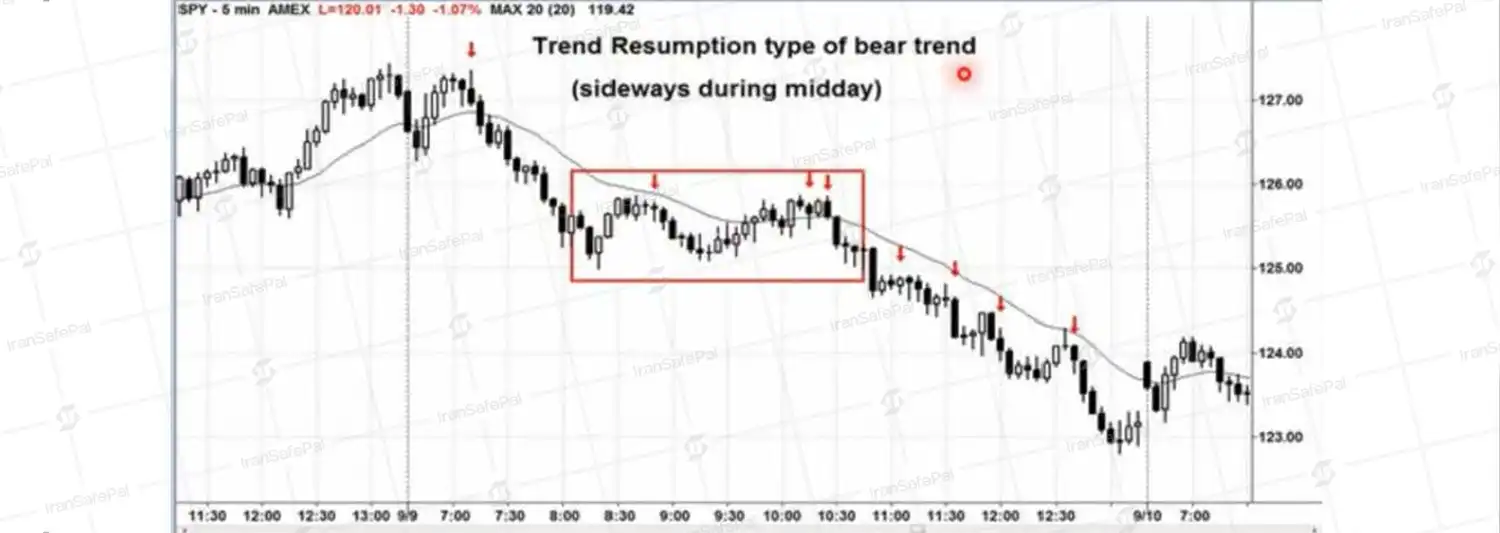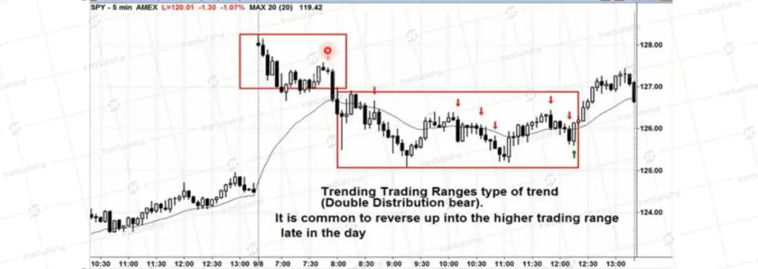 این نوع روند نسبتاً رایج است. در این حالت بازار در یک، دو یا سه ساعت اول، یک دامنه معاملات شکل میدهد. و بعد این دامنه را می شکند. این شکست معمولاً قوی نیست و به اندازه یک، دو یا سه شمع می باشد. و بعد وارد یک دامنه معاملاتی دیگر میشود. گاهی اوقات این حالت برای سه یا چهار بار در روز شکل می گیرد.