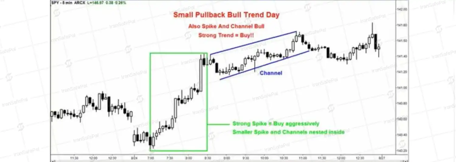 نوع دیگر روند، حالتی است که پولبک های کوچکی داریم و قویترین نوع روند است.اغلب موارد در این روند، انواع دیگر روند را هم داریم. اکثر اوقات از ابتدای روز روند داریم. و معمولاً بخشی از آن اسپایک و کانال است و معمولاً با دامنه های معاملاتی کوچکی در درون آن است. پس دامنه معاملاتی داریم که در روند می باشد و شامل چند دامنه کوچک است.