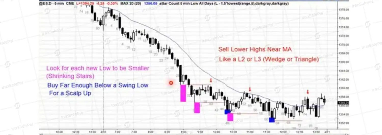 در اینجا هم مثالی دیگر داریم که از ابتدای روز، روند نزولی آغاز شده است. برای فروشنده ها، شمع سیگنال خوبی نیست. چون در دامنه معاملاتی بودیم و یک شمع با بدنه کوچک و سایه بلند شکل گرفته است. پس در این روز ممکن است دامنه معاملاتی داشته باشیم. اما از شمع اول، روند نزولی آغاز شده. معامله گران احتمالا در اینجا ستاپ فروش H2 را داریم، اقدام به فروش کنند. این ستاپ بعد از ۷ یا ۸ شمع نزولی شکل گرفته. و همچنین سطح دوقلو هم داریم که میتوان فروخت. پرچم صعودی داریم که به شکل گوه است. سه حرکت صعودی داریم. یک دو سه. دومین نقطه ورود اینجاست که شمع، با شکاف از میانگین متحرک قرار گرفته است. یعنی کف این شمع بالاتر از میانگین متحرک است. پس یک شمع شکاف است که در روند نزولی شکل گرفته. که معمولاً سیگنال فروش است. سه شمع صعودی داریم و بعد منتظر دومین نقطه ورود هستیم. دومین نقطه ورود برای فروش اینجاست. در اینجا اسپایک صعودی داریم و سه حرکت صعودی داریم. پس میتونه الگوی سه بخشی یا گوه باشد. که نقطه مناسبی برای فروش است. در اینجا ستاپ فروش L2 را داریم. بازار رفته بالا و بعد رفته پایین. یک بدنه صعودی دیگر داریم که تا میانگین متحرک بالا رفته. پس پایین تر از کف می فروشیم. و بعد از اسپایک نزولی قوی، یک کانال میکرو شکل می گیرد.