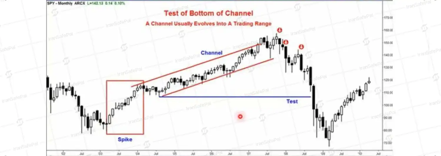 و در اینجا چنین اتفاقی افتاد. این همان چارت اسپایدر است. اسپایدر، صندوق قابل معامله (etf) است. اسپایک و کانال داریم. سپس نزولی شده و بعد خیلی قوی به سمت کف کانال رسیدهایم. پس یک کانال صعودی داریم که به دامنه معاملاتی تبدیل شده است. و به جای دامنه معاملاتی، تبدیل شده به روند نزولی.