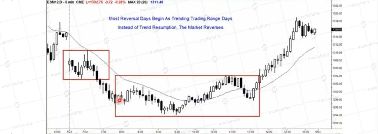 پس اگر یک دامنه معاملاتی داریم که در حال برگشت باشد، آنگاه یک روز برگشتی داریم و اکثر روزهای برگشتی با نوعی از دامنه معاملانی شروع میشود که در روند است. پس هر وقت دامنه معاملاتی داشته باشیم که در روند باشد، آنگاه باید دقت کنید که ممکنه بک روز برگشتی داشته باشیم.پس باید برای شکست در هر جهت آماده باشید.یعنی ممکنه ادامه روند و یا برگشت روند را داشته باشیم.