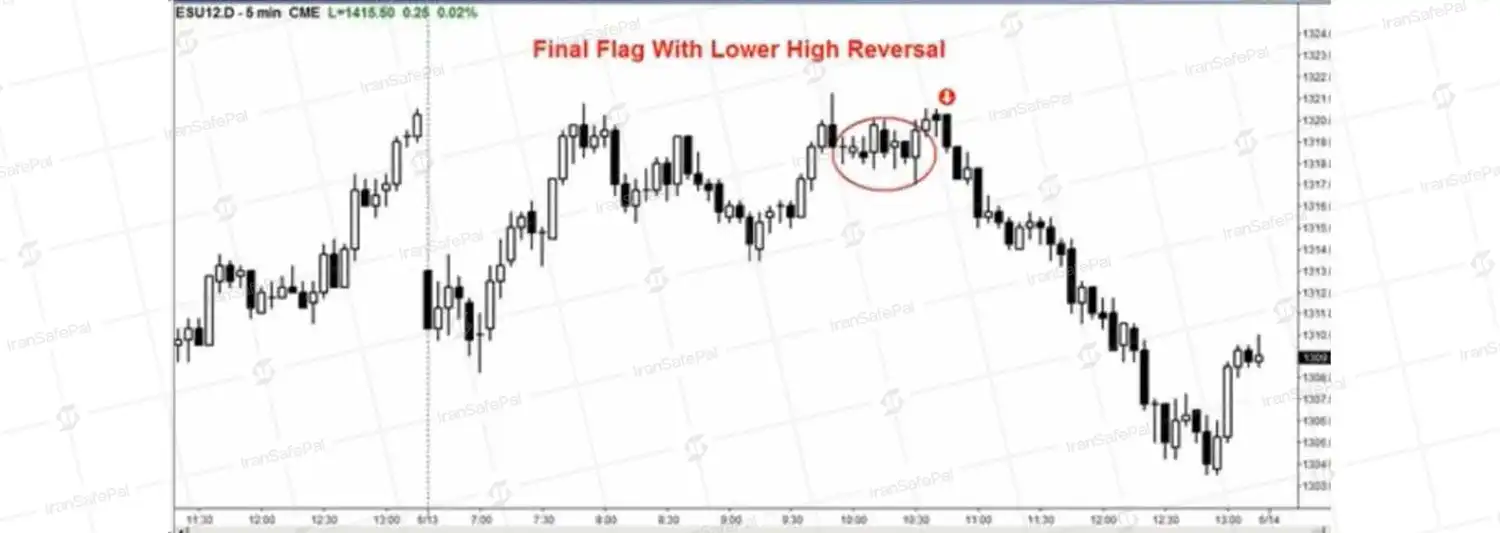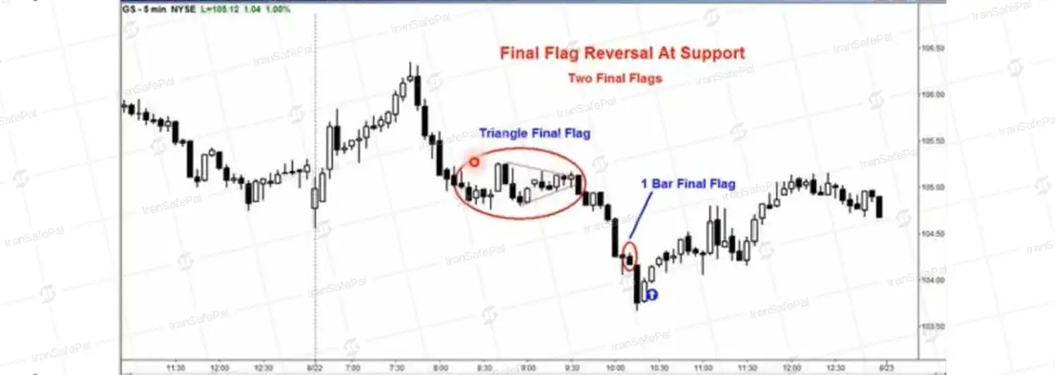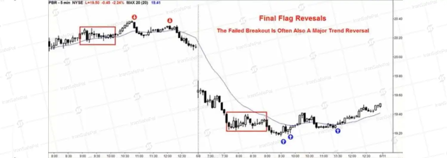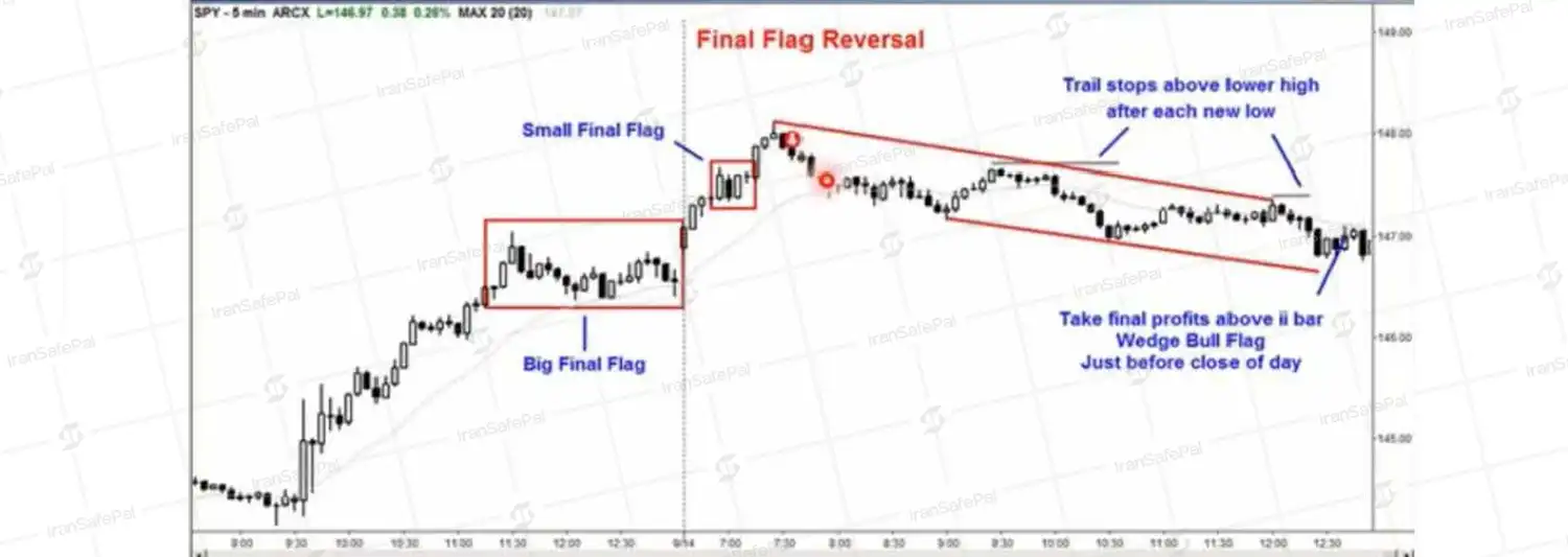 بعد از اینکه روند برمیگردد، می توانید به عقب برگردید و آخرین پرچمی که در روند قبل شکل گرفته را پیدا کنید. که این همان پرچم نهایی است. برای مثال در انتهای روند صعودی، الگوی پرچم صعودی شکل می گیرد و سپس بازار برمیگردد و وارد روند نزولی میشود. این پرچم صعودی، همان پرچم نهایی است.