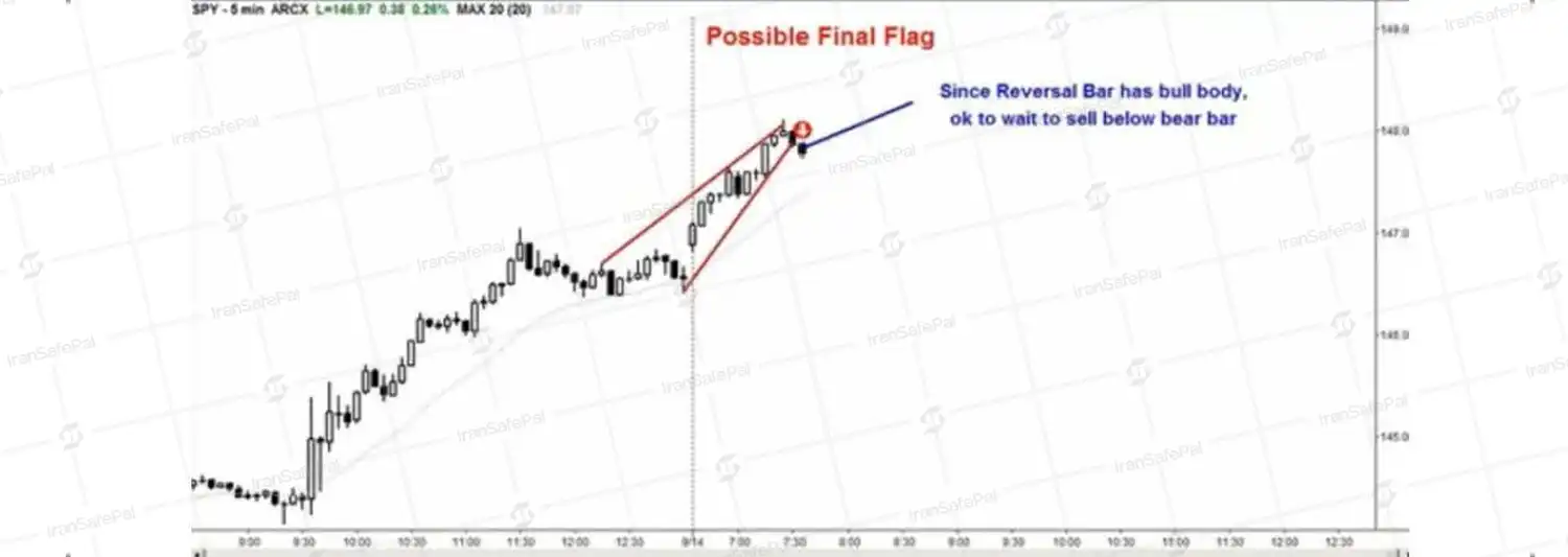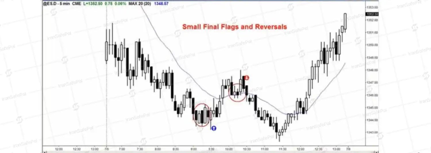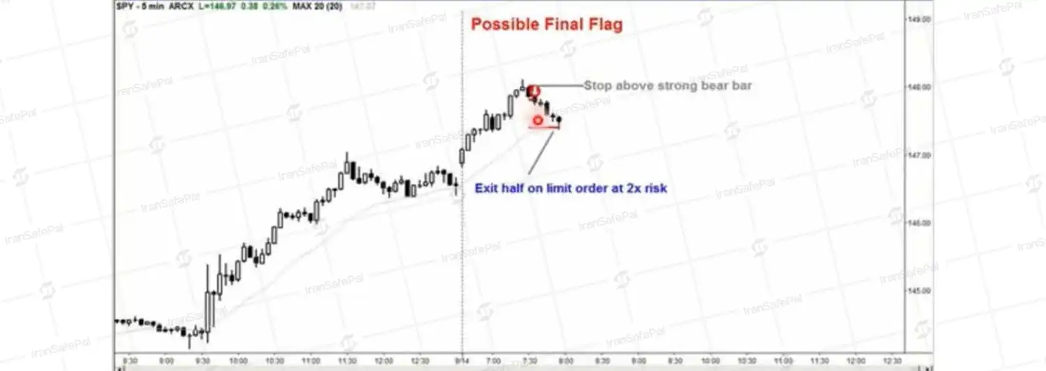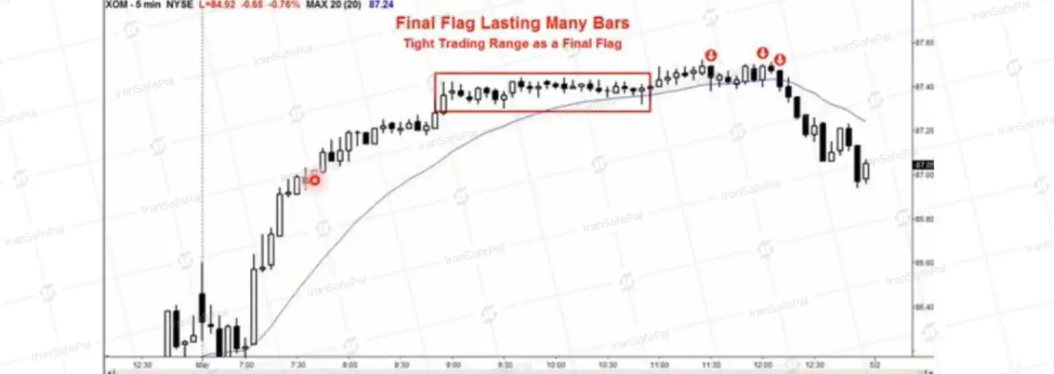 بعد از اینکه روند برمیگردد، می توانید به عقب برگردید و آخرین پرچمی که در روند قبل شکل گرفته را پیدا کنید. که این همان پرچم نهایی است. برای مثال در انتهای روند صعودی، الگوی پرچم صعودی شکل می گیرد و سپس بازار برمیگردد و وارد روند نزولی میشود. این پرچم صعودی، همان پرچم نهایی است.