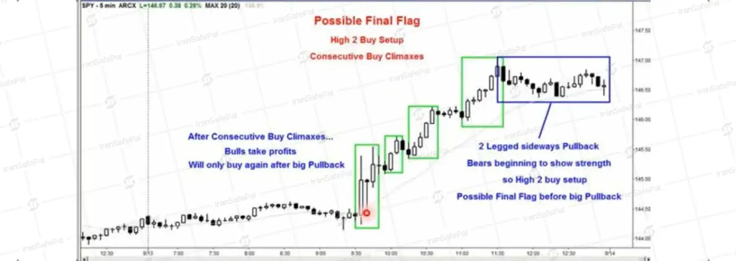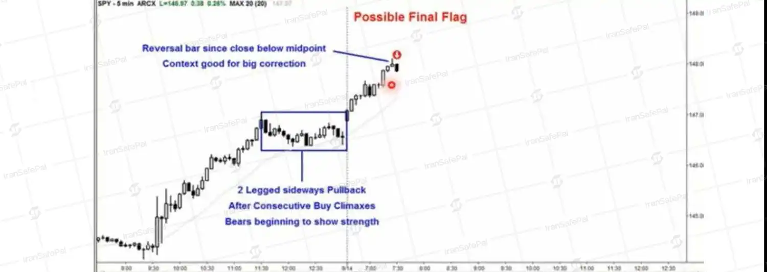 حالت رایج این است که وقتی پرچم نهایی در روند صعودی شکل میگیرد، آنگاه باید یک روند داشته باشیم که برای مدت زیادی شکل گرفته باشد. سپس در زیر سطح مقاومت، ستاپ خرید H2 و یا مثلث شکل دهد. این پرچم معمولاً آخرین پرچم در روند صعودی است. پس وقتی می بینید که در انتهای روند، یک پرچم افقی در حال شکل گیری در زیر سطح مقاومت است، آنگاه باید منتظر باشید که شکست موفق نشود. و سپس بازار به سمت پایین برگردد. که جای مناسبی برای فروش است.