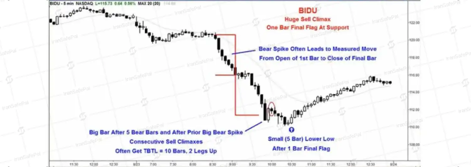 گاهی اوقات ممکنه یک روند نزولی خیلی قوی داشته باشید مانند این سپس پرچم نهایی کوچک در انتهای روند شکل بگیرد که آخرین پرچم در روند نزولی است. ممکنه بگید که این هم پرچم نهایی است اما وقتی یک اسپایک نزولی مثل این داریم، این فرایند را از سر می گیریم. این کلایمکس فروش خیلی بزرگ است که بعد از یک روند خیلی طولانی شکل گرفته است پس باید شک کنید که ممکنه در اینجا کلایمکس داشته باشیم و پایان روند باشد، مخصوصا اینکه بسته حمایت رسیده است. دامنه معاملاتی که در وسط روند شکل میگیرد باعث میشود که روند به همان اندازه ادامه یابد که در اینجا هم اینگونه است. در اینجا یک گام نزولی شروع شده است و بعد دامنه معاملاتی شکل گرفته است. سپس یک گام نزولی دیگر شکل گرفته است که به اندازهای که مشخص شده پایین آمده است. پس در ناحیه حمایتی هستیم. و چند تا کلایمکس فروش داریم و بعد یک شمع اصلاحی داریم که پرچم نهایی می باشد. سپس ۵ شمع داریم که کفهای پایینتری شکل دادهاند و در دو گام شکل گرفتهاند. اکثر اوقات کف پایینتر در قالب ۲ یا ۳ گام شکل می گیرد. سپس یک شمع سیگنال صعودی داریم که یک اینساید بار صعودی است. که نقطه خوبی برای خرید است و می توانیم حداقل تا زمانی که به میانگین متحرک برسد آن را نگه داریم. معمولا وقتی چند تا کلایمکس فروش داریم، بازار سعی می کند یک تیک بالاتر از کلایمکس فروش را تست کند. امروز کاملاً به این نکته نرسیده است اما ممکنه فردا به آنجا برسد.