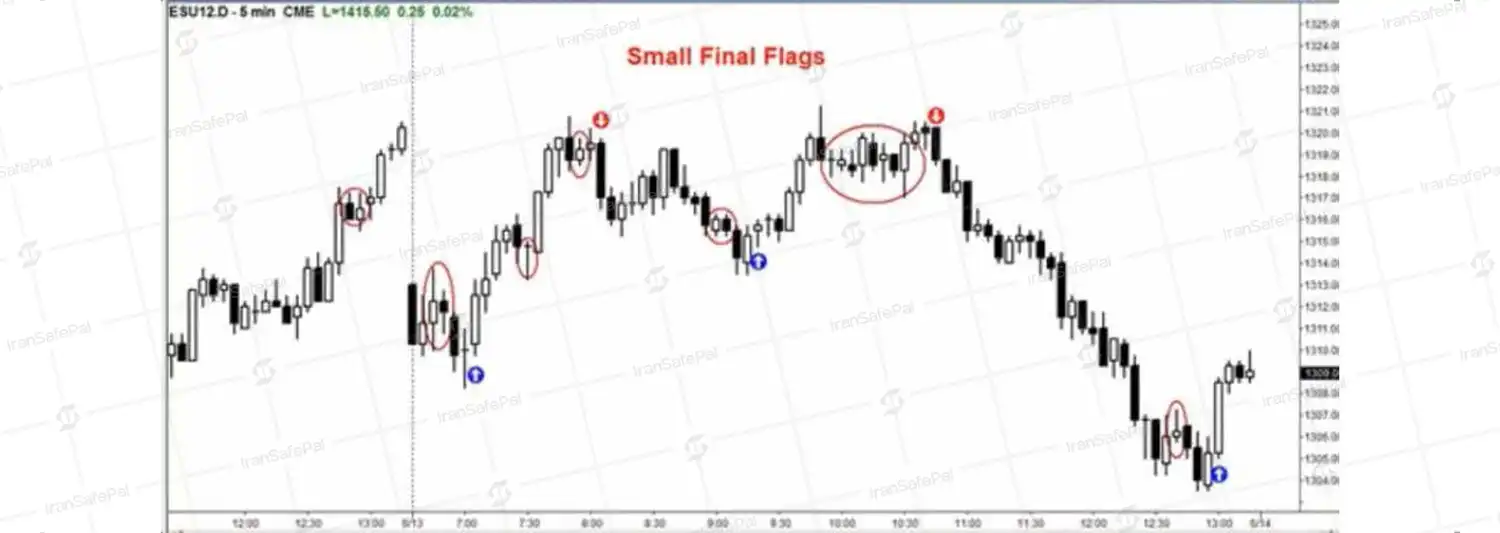 این الگو را در روند های کوچک هم داریم. حتی یک گام کوچک در دامنه معاملاتی هم میتواند با پرچم نهایی به پایان برساند. میتوانیم یک پرچم نهایی کوچک داشته باشیم و بعد شکست داریم که این شکست به نتیجه نمیرسد و برگشت شکل می گیرد.