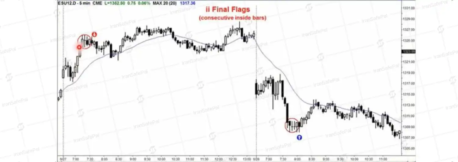 پرچم نهایی در قالب الگوی ii . وقتی یک شمع در درون شمع قبلی جا گرفته باشد و شمع بعد از آن هم در درون اینساید بار اولی شکل گرفته است آنگاه دو اینساید بار متوالی داریم. این همان الگوی ii است که ستاپ شکست می باشد. یعنی بازار میتواند این الگو را در هر جهتی بشکند و در هر جهتی ادامه یابد. وقتی الگوی ii در انتهای روند شکل می گیرد، معمولا همان پرچم نهایی است.