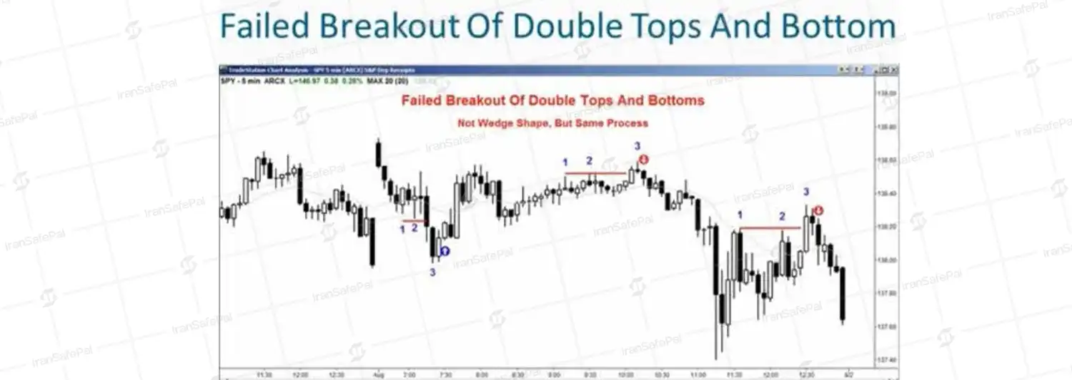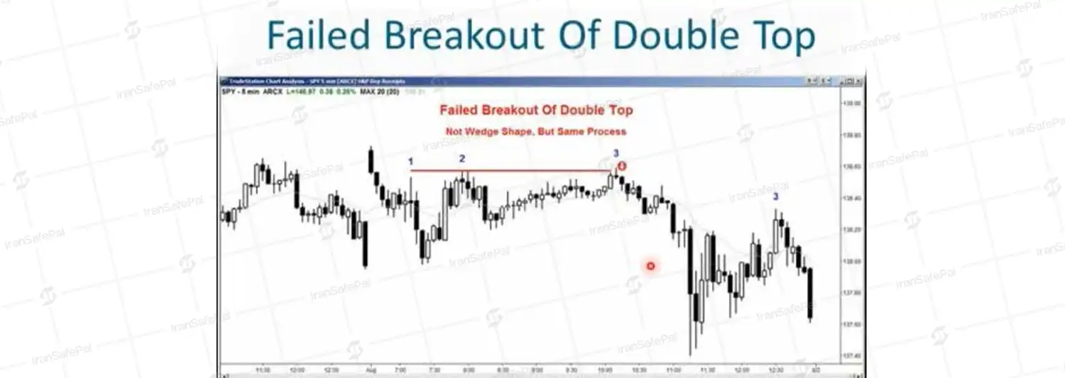 ممکن است که در الگوی سقف و کف دوقلو شکست ناموفق داشته باشیم. ولی شکل آن شبیه گوه نباشد؛ اما همان فرآیند مشابه را داریم و با آن همانند گوه رفتار می¬کنیم. این الگو را چند دقیقه پیش توضیح دادم. در اینجا هم یک الگوی گوه داریم؛ سقف دو قلو داریم و بعد شکست صعودی داریم که موفق نبوده و سپس روند نزولی شکل می¬گیرد. در اینجا یک طرف دوقلوی کوچک داریم و شکست نزولی قوی شکل گرفته است؛ سپس الگوی دو کندل بازگشتی شکل گرفته است یا این¬سایدبار صعودی داریم هر کدام از اینها را میتوانیم در نظر بگیریم؛ پس این سومین گام نزولی است و بعد برگشت صعودی را داریم.