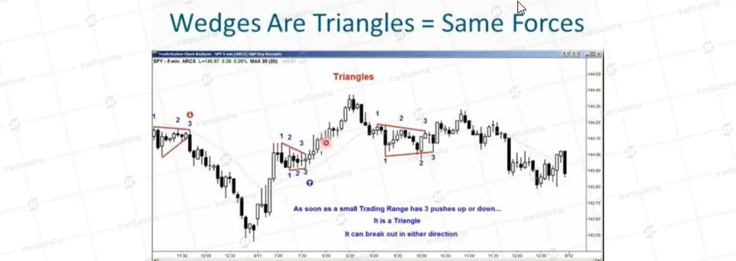 الگوی گوه و مثلث هر دو یک چیز هستند؛ یعنی فرآیند یکسانی دارند. در هر دو الگو سه حرکت داریم در اینجا افقی است. سه حرکت صعودی داریم. یک مثلث شکل گرفته است. در اینجا سه حرکت نزولی داریم؛ یک، دو و سه. افقی است و مثلث داریم. در اینجا سه حرکت نزولی داریم؛ یک، دو و سه. همچنین سه حرکت صعودی هم داریم که حرکت صعودی میتواند قبل از حرکت نزولی شکل بگیرد و حرکات نزولی هم میتوانند قبل از حرکات صعودی شکل بگیرد. اهمیتی ندارد تا وقتی که در یک دامنه معاملاتی، سه حرکت شکل بگیرد، آنگاه من آن را مثلث در نظر میگیرم چه به شکل مثلث باشد چه نباشد. برای مثال در اینجا گام دوم پایین تر از گام اول قرار گرفته است و این به شکل مثلث نیست؛ اما این پرایس اکشن عملکرد یکسانی با مثلث دارد و من آن را مثلث در نظر میگیرم و میتواند در هر جهت شکسته شود.